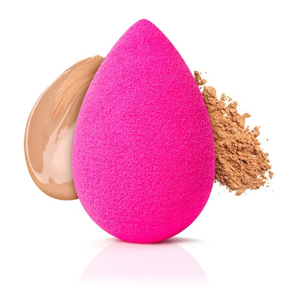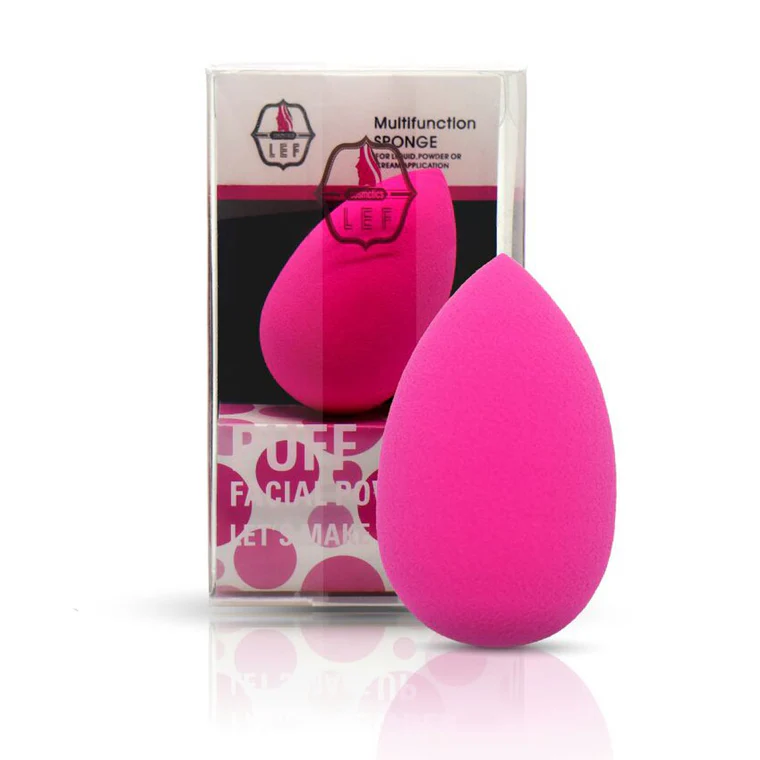 إسفنجة وردية اللون مصممه للدمج والتوزيع، تأخذ شكل الدمعة، احد الاطراف نحيف ومدبب للمناطق الضيقة مثل العين وزاويه الانف، والطرف الاخر كبير ومدور للأماكن الواسعة بالوجه